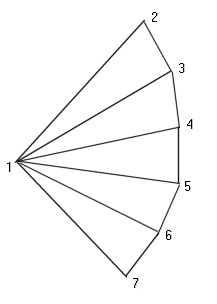 Последний примитив, связанный с флагом DSDPTJTRIANGLEFAN, также предназначен для построения группы связанных треугольников, но данные потока здесь трактуются немного иначе, чем в предыдущем случае: вторая, третья и первая вершины определяют первый треугольник, третья, четвертая и первая ассоциированы со вторым треугольником, и т. д. То есть треугольники связаны, подобно раскрою зонтика или веера. Первая вершина потока ассоциирована с центральной точкой (рис. 7.17), а порядок перечисления вершин особенно важен для режима отключенной интерполяции цветов вершин.