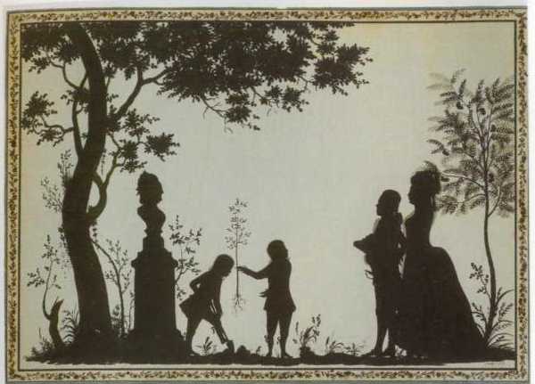 Великий князь Павел Петрович и Мария Федоровна в парке с детьми Александром и Константином. Силуэт И. Ф. Антинга. 1790 г.
