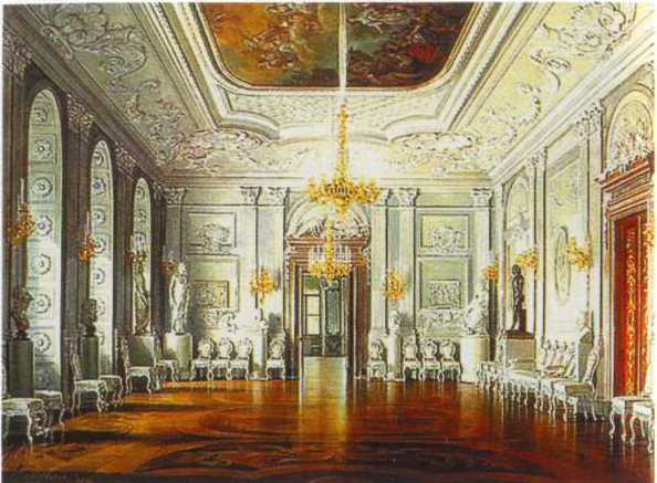 Белый зал в парадной половине Павла I в Гатчине. Акварель Э. П. Tav. 1877 г.