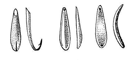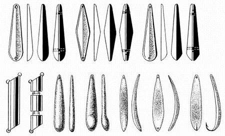Практически на протяжении всего сезона ловли со льда судак отдает предпочтение так называемым падающим вертикальным блеснам (рис. 10). Специфика этих блесен заключается в том, что они в кратчайший отрезок времени должны быть доставлены к хищнику на солидную глубину, т.е, условия ловли диктуют жесткие требования к конструкции приманки и ее обтекаемой форме. После сброса приманка, движется к нижней точке падения без отклонений от траектории движения. Блеснильщик сверлит сотни лунок, проходит километры в поисках хищника, и он не может тратить время на медленное погружение легкой планирующей приманки на глубину.