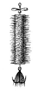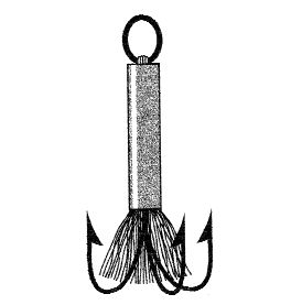 В большинстве рек окунь предпочитает объемные или даже цилиндрические приманки (трубчатые). Времена, когда в окуневой блесне ценилась возможность при бешеном клеве из одной лунки вытащить максимальное количество рыбы, и с этой целью спиливалась бороздка крючка или вместо него устанавливалась загнутая иголка – давно прошли. Часто окунь реагирует не на саму блесну, а на плавно раскачивающийся тройник, обрамленный пучком красных или оранжевых синтетических ниток (хуже шерстяных), или на замаскированный подобным образом крючок, висящий на цепочке или на монофильном поводке (рис. 13).