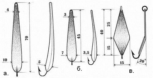 Большинство окуневых блесен привлекает хищника при разных темпах игры. Даже с одной уловистой приманкой поймать рыбу удается независимо от времени и сезона ловли. Хотя давно известно, что на разных водоемах окунь предпочитает блесну определенной формы с различными нюансами игры (рис. 12). На водоемах Подмосковья окунь предпочитает узкие вытянутые блесны (рис. 12 а, б). В озерах Тверской области – лучше реагирует на достаточно широкие планирующие приманки (рис. 12в).