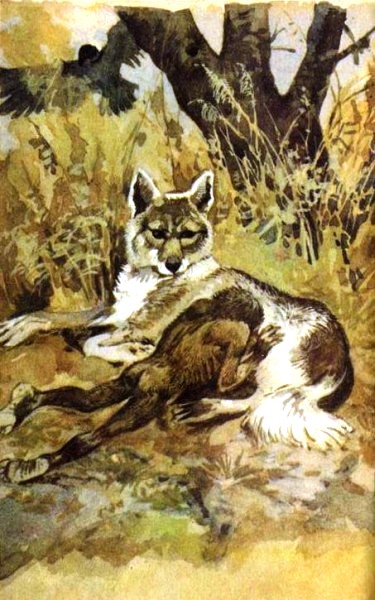 Вскоре река повернула влево. Идя по отмели, они обогнули мыс, круто вдававшийся в воду. Вдруг собака остановилась и припала к земле: на отмели возле самой воды лежал молодой олень, на боку его виднелась глубокая рана — след вчерашней битвы на пожаре. Настороженно прислушиваясь и оглядываясь, собака подползла к нему. Это была пища! Острыми зубами собака впилась в неожиданную добычу. Она торопливо рвала и глотала мясо, пока не почувствовала, что сыта. Рам не отставал от неё, его зубы действовали не хуже ножа. Но вдруг собака отскочила от оленя и глухо заворчала. Шерсть на её спине поднялась: среди деревьев на обрыве раздались шорох и тихие возгласы. В несколько скачков на отмель спустились мохнатые существа. Со всех ног они кинулись к оленю.
