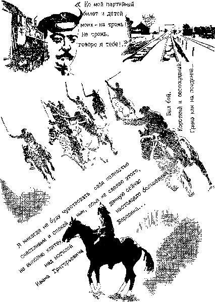 “…Избитого в кровь, разутого, в порванной рубахе, Бородина поставили под то самое дерево, на котором раньше бандиты “поручика Викентия” повесили всю семью Бородина. По бокам стояли два вооруженных бандита. А с дерева свисала толстая веревка, заканчивающаяся петлей. Другой конец веревки держал в руках здоровенный бандюга. (Михейкин, рассказывая обо всем этом, не выдержал, всхлипнул.) Перед Бородиным стоял поручик. Несколько минут немигающе он смотрел на Ивана Григорьевича, а потом негромко сказал: “Я же предупреждал вас, Бородин. Почему вы меня не послушались?” Начальник станции стоял, переминаясь на колкой земле и повернув голову в сторону. “Помните, я предупреждал вас, Бородин, — продолжал изверг, — в тот раз, когда вы пропустили для большевиков эшелон с оружием и не поставили меня в известность? И я вас тогда простил… А вы ничего не поняли, хотя и получили мое уведомление. Разве не так?” “Кончай, гад, кончай, Викентий, — ответил Бородин. — Чего волынку тянуть?” “Не Викентий, — возразил тот, улыбаясь, — а Викентий Модестович. Ах, какая ты неразумная скотина! Я приказал повесить твою семью, думал, наконец-то ты образумишься, поймешь, что тебе лучше будет служить мне, а не затевать со мной рискованные игры… А ты… Что сделал ты, а? Снова пропустил большевистский эшелон; теперь мой отряд, мои орлы будут голодать. Нехорошо, голубчик, очень нехорошо. Но я великодушный человек. И еще раз простил., И что же? Ай-яй-яй-яй!.. Вы снова пропускаете к красным эшелон с провиантом… Право, господин Бородин, вы дурне поступили. Вот и пришел ваш черед, голубчик. Извините, но на войне, как на войне”. “Ничего, Викентий, — ответил Бородин, — за все тебе отквитается, за все твои злодеяния. Помяни мое слово!” “Помяну, Бородин, помяну. Обязательно. Орать-то будете, когда вздергивать станем?” “Не знаю. Посмотрим…” “Что ж, посмотрим, — кивнул поручик и приказал: — Кончайте с ним. Пожалуйста…”