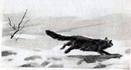 А голос его был совсем тоненький от страха. Он помчался вверх, в гору. Но чёрный длинный зверь мчался ещё быстрей. Он делал огромные прыжки. Он догнал Олешка. Перегнал. И… остановился как вкопанный. Подняв хвост трубой, он стал оглушительно мурлыкать в тишине и важно расхаживать перед Олешком поперёк тропки, прижимаясь боками к сугробам.