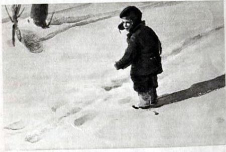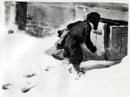 Олешек крепко зажимает в левой руке обе свои рукавицы и папину записку, а правой подвигает ящик и влезает на него.