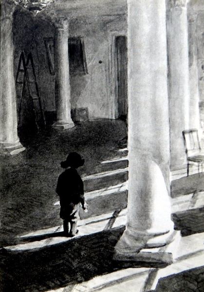 Длинные-длинные слёзы покатились по Олешкиным щекам. Что он скажет маме? И как он теперь к ней пойдёт без папиной записки? Грустный, он пошёл дальше, дошёл до стеклянной двери, завешенной занавеской, толкнул её и очутился…