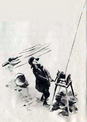 Он тянет проволоку, толкает рукоятку. А Олешек висит в бадье. Вниз — далеко, вверх — высоко.