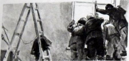 Тут в окне за стёклами чья-то рука берёт с подоконника кисть и бумажную шляпу, чьи-то глаза, остановившись, глядят на Олешка. Ну конечно, это бригадир маляров тётя Паня. Вот она молча всплеснула руками и убежала. А это кто с таким страшным белым плоским носом? И почему он беззвучно раскрывает и закрывает рот, как рыба в аквариуме? Да это ж завхоз Николай Иванович! Просто он прижался к стеклу и нос его расплющился. Он что-то кричит, а через стекло не слышно.