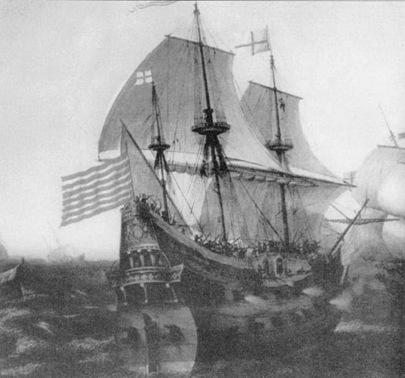 Испанский галеон, скорее всего «Sun Martin», в сражении при Грейвлайнсе, кампания 1588 г. Обратите внимание на боевые марсы на фок- и грот-мачтах. Фрагмент картины маслом кисти Хендрика Корнелиша Врома.