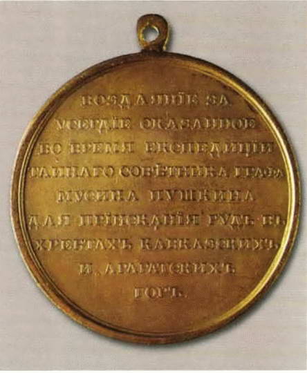 Медаль в «воздаяние за усердие, оказанное во время экспедиции тайного советника графа Мусина-Пушкина для приискания руд в хребтах Кавказских и Араратских гор»