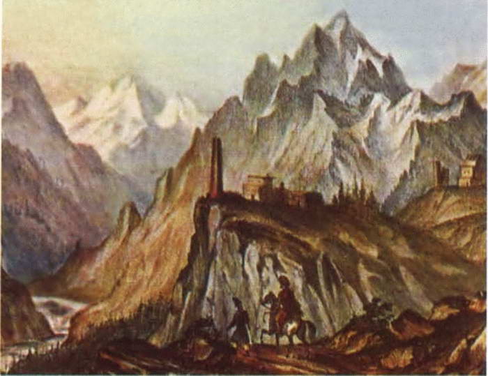 Вил Крестовой горы из селения близ Коби. Раскрашенная автолитография М.Ю. Лермонтова, 1837—1838 гг.