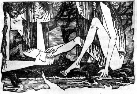Пыхтун, с нетерпением ожидавший осени — времени своего посвящения в охотники, — постоянно помнил, что стал уже совсем взрослым мужчиной. И потому на берегу не колебался ни мгновения. Мужчина всегда должен защищать детей и женщин — о чём тут думать, коли кто-то зовёт на помощь? Паренёк кинулся в воду сразу, как только увидел руку среди веток, даже ещё до того, как услышал крик Снежаны. В несколько гребков он добрался до дерева и схватился за ближний сук — чем принёс больше вреда, чем пользы. Но тут же поправился, позволив девочке сделать большой глоток воздуха, а потом заплыл с другой стороны, потянул крону к себе и поднял голову малышки уже довольно высоко над водой. Подождал, пока Снежана отдышалась, спросил: