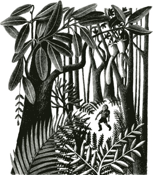 Идти по джунглям было очень тяжело. Липкие листья папоротника цеплялись за волосы, он всё время спотыкался о корни деревьев и полусгнившие стволы, лежащие на земле. Иногда деревья так переплетались между собой, что продраться сквозь них было невозможно и приходилось обходить, делая большой крюк.