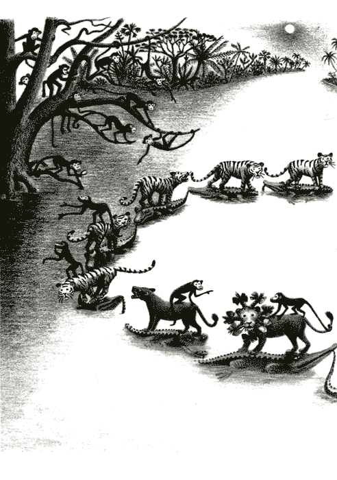 Когда папа пробегал по пятнадцатому крокодилу и ему оставалось прикрепить два последних леденца, обезьяньи крики на берегу внезапно смолкли, и раздался более громкий и грозный шум, приближавшийся с каждой секундой. Папа обернулся и увидел бежавших к реке семерых разъярённых тигров, одного негодующего носорога, двух кипящих яростью львов и одну раздражённую гориллу вместе с бесчисленной стаей визжащих обезьян, а возглавляли всю компанию два взбешённых кабана. Вся толпа с топотом и криком устремилась к берегу, вопя:
