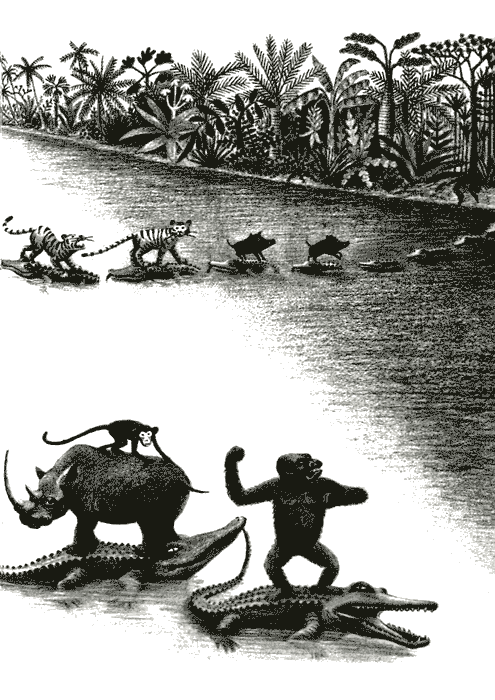 Внезапно крики, рёв и визг сделались ещё громче, и папа подумал, что звери уже добрались до берега. Он оглянулся и увидел удивительную картину, которая не могла его не обрадовать. Может быть, оттого, что у него кончился леденец, или же просто потому, что крокодилы, как я вам уже объяснял, ненадёжны и переменчивы нравом, первый крокодил вдруг отвернулся от берега и поплыл вниз по реке. Второй крокодил поплыл вслед за первым, продолжая сосать свой леденец и ни на дюйм не отставая от хвоста первого. Третий поплыл за вторым и так далее, все они поплыли друг за другом, вытянувшись в одну линию. Два кабана, семеро тигров, носорог, два льва, горилла и бесчисленное множество визжащих обезьян вдруг оказались на середине реки. Они уплывали вниз по течению на цепочке крокодилов, сосавших леденцы на палочках. Звери хрюкали, рычали и ревели и не могли сообразить, что им теперь делать.