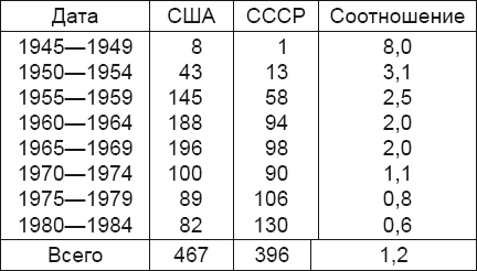 В 1945–1954 гг. соотношение между двумя странами в области испытания ядерного оружия выглядело следующим образом: США – 51 испытание, СССР – 14, в 1955–1964 гг. соответственно 333 и 152, в 1965–1974 гг. – 296 и 160, в 1975–1984 гг. – 171 и 236.