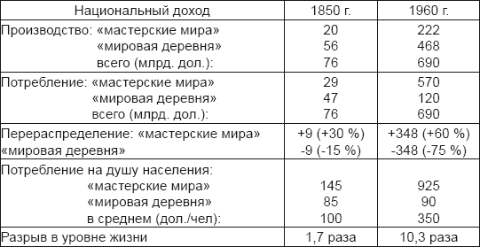 Из приведенных данных явствует, что в середине XIX века «мастерские мира» на 70 % жили за счет собственного производства, а «мировая деревня» теряла около 15 % производимого ею национального дохода, причем первые превосходили вторую по уровню жизни не более чем в два раза.