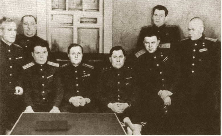 Руководящий состав полевого управления Волховского фронта: начальник артиллерии Г. Е. Дегтярев, начальник штаба Ф. П. Озеров, член военного совета К. С. Грушевой, командующий войсками фронта К. А. Мерецков, член военного совета Т. Ф. Штыков, командующий 14-й воздушной армией И. П. Журавлев, начальник инженерных войск А. Ф. Хренов, начальник тыла Л. П. Грачев. 1943 г.