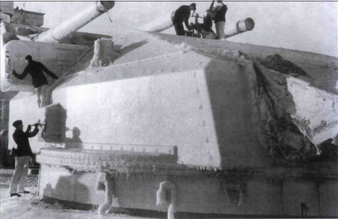 Моряки скалывают лед с башни главного калибра линкора «Гнейзенау», операция «Берлин». Тонкая корка льда не ухудшала остойчивость корабля, но мешала открывать люки и двери, покрывала линзы оптических приборов. На башне установлен 20-мм счетверенный зенитный автомат.