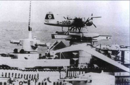 Арадо Ar-196A-4 (T3+EK) на катапульте карманного линкора «Адмирал Шеер», 1940 или 1941 г. г. Самолет принадлежит Bordfliegergruppe-196, в данном подразделении проводились испытания гидросамолетов корабельного базирования. Двигатель самолета зачехлен. Хорошо видно леерное ограждение площадки катапульты. Между поплавком самолета и хвостовым оперением просматривается антенна РЛС.