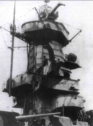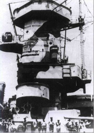 Рисунок камуфляжа на правой стороне носовой надстройки «Шпее» разительно отличался от раскраски той же надстройки с левой стороны. В верхней части надстройки над оптическим дальномером смонтирована антенна РЛС FuMO-22, РЛС установили в 1938 г., через два года после того, как на корабле появился экспериментальный вариант данной РЛС. Снимок сделан в Монтевидео.
