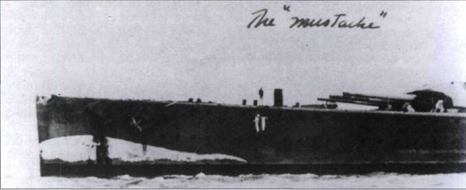 Два моряка ремонтируют пробоину в борту «Шпее» после сражения при Ла-Плате с британскими крейсерами. Снимок сделан 14 декабря 1939 г. в Монтевидео. Представитель британских ВМС сделал на снимке надпись «The 'Mustache'» с целью обратить внимание на нарисованный на борту корабля фальшивый бурун.