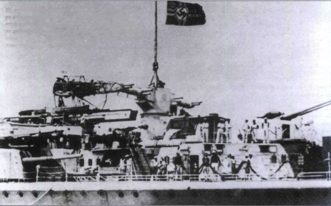 На кормовом оптическом дальномере главного калибра «Адмирала Шпее» реет Rekhskriegsflagge (Германский военный флаг), Монтевидео. Перед дальномером на катапульте стоит обгоревший остов гидросамолета Ar-196. За дальномером, ближе к корме, установлена спаренная 105-мм зенитка.