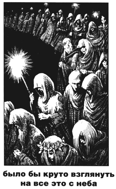 Тут же люди стали группами и по одному выходить из пивной и рассаживаться по машинам и байкам. Элли и Яромир поманили меня, я вышел, оставив деньги за пиво на деревянном столе. Во дворе уже ревели байки. Откуда-то в руках у людей взялись факелы и запылали в нахлынувшей на луга тьме. Огромная процессия с огнями двинулась куда-то прочь от города — пешком, на разрисованных автомобилях, на харлеях, которые освещал мятущийся свет факелов, все ехали и шли медленно, удаляясь в холмы. Элли и Яромир шли рядом со мной с факелами в руках.