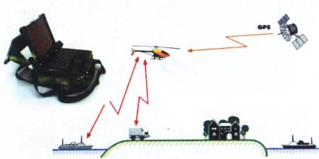 Наземный пульт управления БЛА и схема связи вертолета-робота со спутником навигации, наземными и морскими станциями слежения.