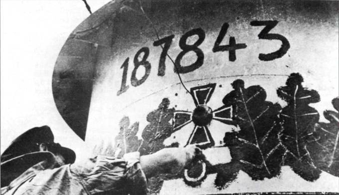 Член команды U-103 наносит особое украшение, свидетельствующее о самой высокой награде командира подводной лодки, по крайней мере на раннем этапе войны. Претендуя на потопление 187843 брт торгового тоннажа, капитан-лейтенант Шютце был награжден дубовыми листьями к рыцарскому кресту. Завышение своих побед было общей проблемой во всех флотах, но большая часть заявленного Шютце было подтверждено, и закончил войну он третьим из лидирующих асов- подводников. Матрос использует изолятор антенного ввода как центр нарисованного железного креста.
