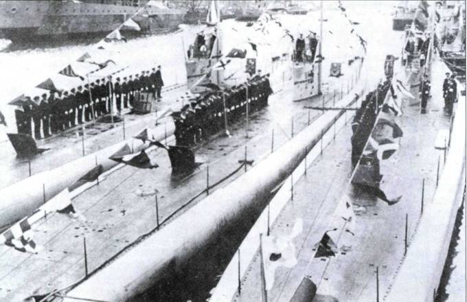 Проекты германских подводных лодок второй мировой войны ведут свое происхождение от серий подводных лодок, построенных по немецким чертежам для других стран. На снимке представлены три субмарины финского флота, «Ветехинен», «Весихииси» и «Ику-Турсо» (слева направо). Построенные в 1930-31 гг. по проекту, разработанному расположенным в Голландии Бюро развития подводного флота, лодки типа «Ветехинен» были экспериментальными прототипами для более поздних средних лодок VII серии. Испытанные германскими командами до передачи финнам, они обеспечили разработчиков очень ценной информацией в период, когда у Германии не было собственных субмарин.