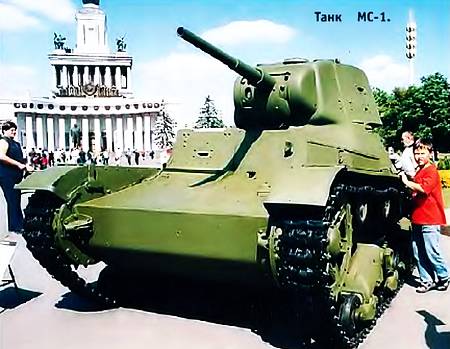 Они встречали посетителей у самого входа на ВВЦ. На почетном месте красовался танк МС-1 (он же — Т-18, малый танк сопровождения). «Это был первый серийный советский танк, производство которого было начато в 1927 году, — пояснил мне сотрудник танкового музея в Кубинке, механик-смотритель А.А. Анфиногенов. — А уже в 1929 году эти танки приняли участие в боях на Китайско-Восточной железной дороге. Вообще у танков этих оказалась нелегкая судьба: из 962 построенных машин к началу Великой Отечественной войны уцелело лишь 18, да и те были уничтожены в первые же дни сражений. Так что нынешний экспонат — раритет, восстановленный трудами сотрудников нашего музея»…