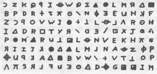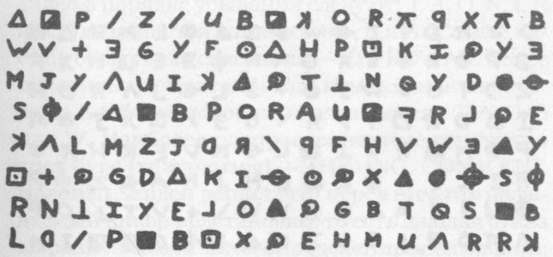Каждая треть шифровки состояла из восьми строк по семнадцать знаков: греческие буквы и буквы латинского алфавита, азбука Морзе, метеорологические символы, семафорная азбука, астрологические символы.