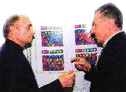 Е.Шевцов(слева) демонстрирует особенности конструкции интерактивной клавиатуры.
