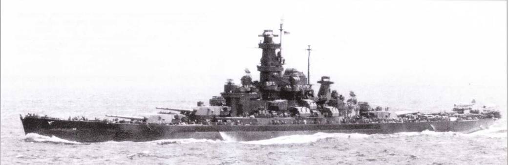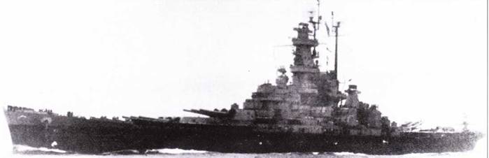 «Алабама» — один из многих действовавших на Тихом океане кораблей, которые в 1944 г. были перекрашены но схеме Ms. 21. Снимок сделан с борта авианосца «Эссекс» к конце 1944 г. Подобно «Южной Дакоте», на «Алабаме» сохранили носовой радиолокатор SG и добавили второй радар такого же типа на грот-мачте. Зенитное вооружение «Алабамы» было чуть слабее, чем на «Массачусетсе»: только 12 Бофорсов.