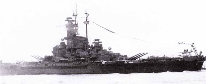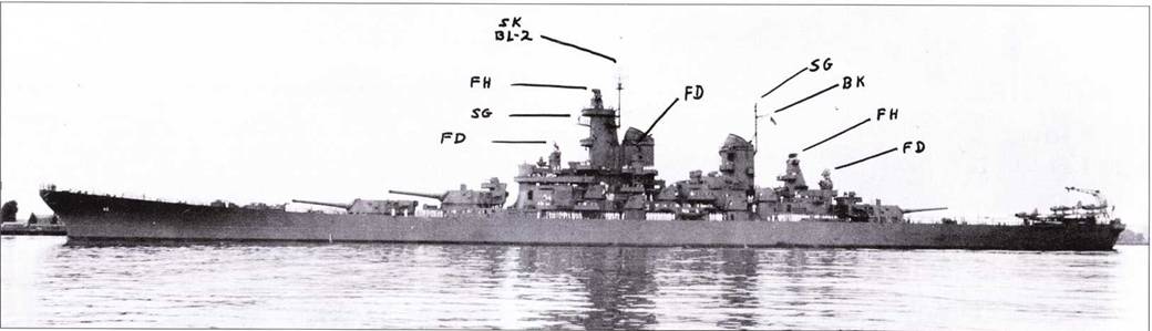 «Алабама» держит курс домой. Можно различить изменения в радиолокационном хозяйстве линкора, выполненные к феврале 1945 г. На главной мачте смонтирована антенна РЛС SK-2 и пара антенн системы постановки помех TDY, также на главной мачете стоят антенны РЛС SK и SG. Корабль окрашен по схеме Ms. 22.