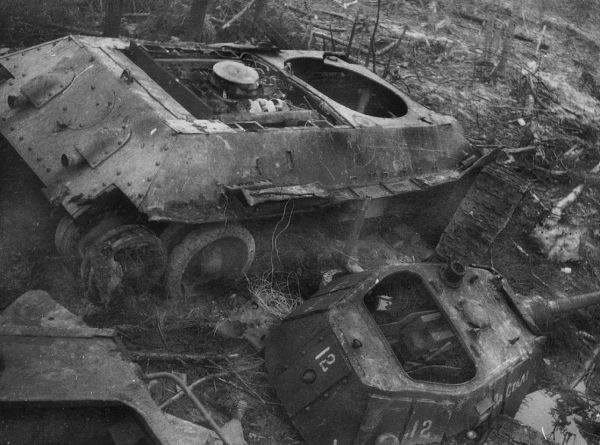 Башня этого танка Т-34 сорвана внутренним взрывом. Боекомплект 76-мм выстрелов, к сожалению, детонировал довольно часто. Весна 1942 года