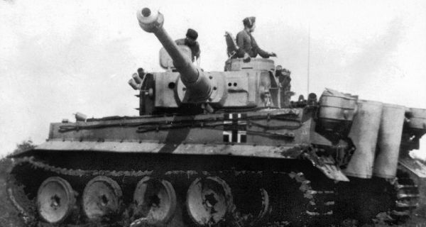 Один из «тигров» 502-го тяжелого танкового батальона. Лето 1943 года. Обращает на себя внимание эмблема — черный крест с белой окантовкой, вписанный в черный квадрат — характерная только для этого батальона.