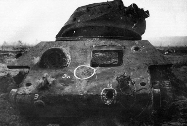 Подбитый танк Т-34. Отчетливо видно отверстие от попадания 88-мм снаряда в борту башни. Кроме того, другим снарядом оторвана бронемаска пушки