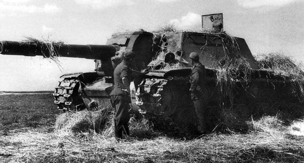 Подбитая советская тяжелая САУ СУ-152. В лобовой броне рубки хорошо видны пробоины от 88-мм снарядов