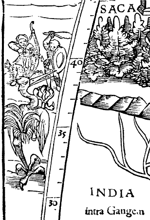 Рис. 18. Пигмеи из Индии сражаются с аистом. Фрагмент карты «античного» Птолемея, опубликованной, однако, лишь в 1540 году или даже позже С. Мюнстером. Взято из [1353], Tabula Asiae VIII.