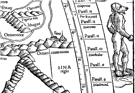Рис. 19. Азиаты с собачьими головами. Фрагмент карты «античного» Птолемея, напечатанной С. Мюнстером. Взято из [1353], Tabula Asiae VIII.