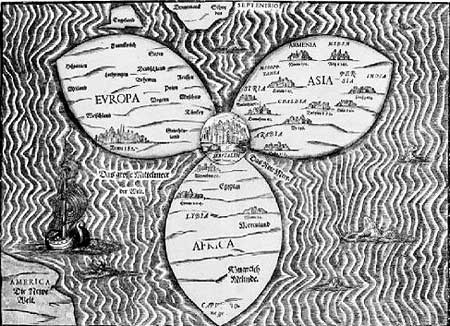 Рис. 68. Старая карта якобы 1581 года. В центре мира, в том месте, где сходятся Европа, Азия и Африка, помещен город Иерусалим. Взято из [1083], титульный лист.