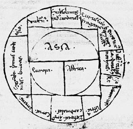 Рис. 71. Средневековая скандинавская карта якобы XIV века. Обитаемый мир разделен на три части Т-образным крестом. Карта номер 2 из рукописи Fabr. 83,8/0. Взято из [523], с. 113.