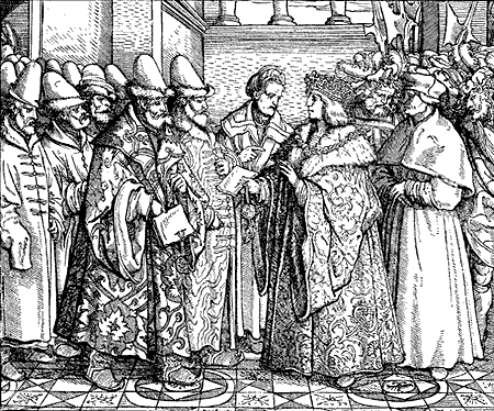 Старинная миниатюра из «Царственной Книги», изображающая, как у Василия III из больной ноги течет кровь и гной. Взято из [578], кн. 2, с. 337, илл. 274