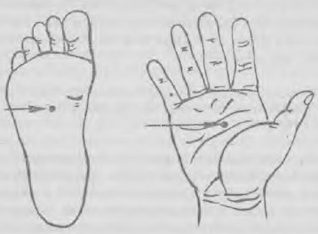Существует некий принципиальный момент, соблюдать который надлежит неукоснительно и ежесекундно. Речь идет о точке приложения внимания, о том, как мы осознаем (если вообще осознаем) свои ноги, точнее, ступни. Только зеле-¦ые новички да великие мастера могут позволить себе роскошь не уделять часть внимания ногам. Для первых это *ще пустой звук и никчемные мелочи, для вторых – естественным образом пройденный этап, растаявший извне и >/шедший вглубь. При этом фиксация есть, но она не видна и машинальна, словно дыхание, с каковым, кстати, происходит точно такая же эволюция. Говоря о фиксации, не следует понимать её как некую привязку текучего и живого разума к чему бы то ни было. О ступнях достаточно помнить,знать, что они есть, и ощущать их как часть тела, но не вообще, а как бы одной точкой. Эти точки, именуемые Юнъ-цюань,располагаются в центре подошвы, чуть ближе к пальцам, примерно на одной трети длины стопы. Они соответствуют ладонным точкам Лао-гун,являясь вместе с ними четырьмя из пяти «ворот», через которые возможен забор и вынос энергии. Пятые «ворота» – лицо (в целом).