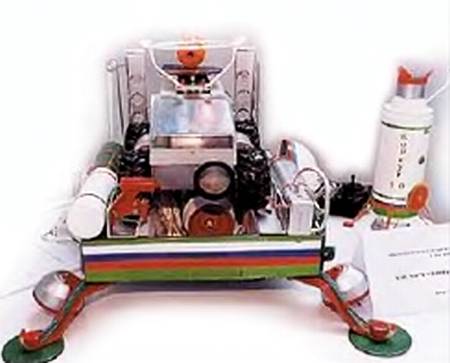 — Вот этот лунный модуль — бывшая часть вышедшей из употребления кофеварки, — пояснил конструктор корабля для облета Луны Артем Зайцев. — А в качестве обтекателя использована часть пластиковой игрушки…