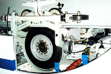 Для снижения шума применены надувные резиновые колеса. Внутри них спрятаны металлические кольца, так что, даже если резина лопнет, вагон просто «сядет» на монорельс и спокойно доедет до ближайшей станции.