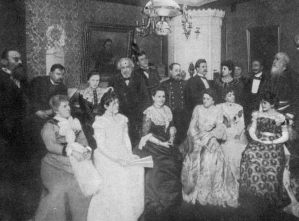 В гостях у В. В. Стасова. Среди присутствующих: Н. А. Римский-Корсаков, Ц. А. Кюи, А. К. Глазунов, Ст. и В. М. Блуменфельды, В. В. и А. В. Стасовы, М. Г. Савина. В глубине комнаты Ф. И. Шаляпин